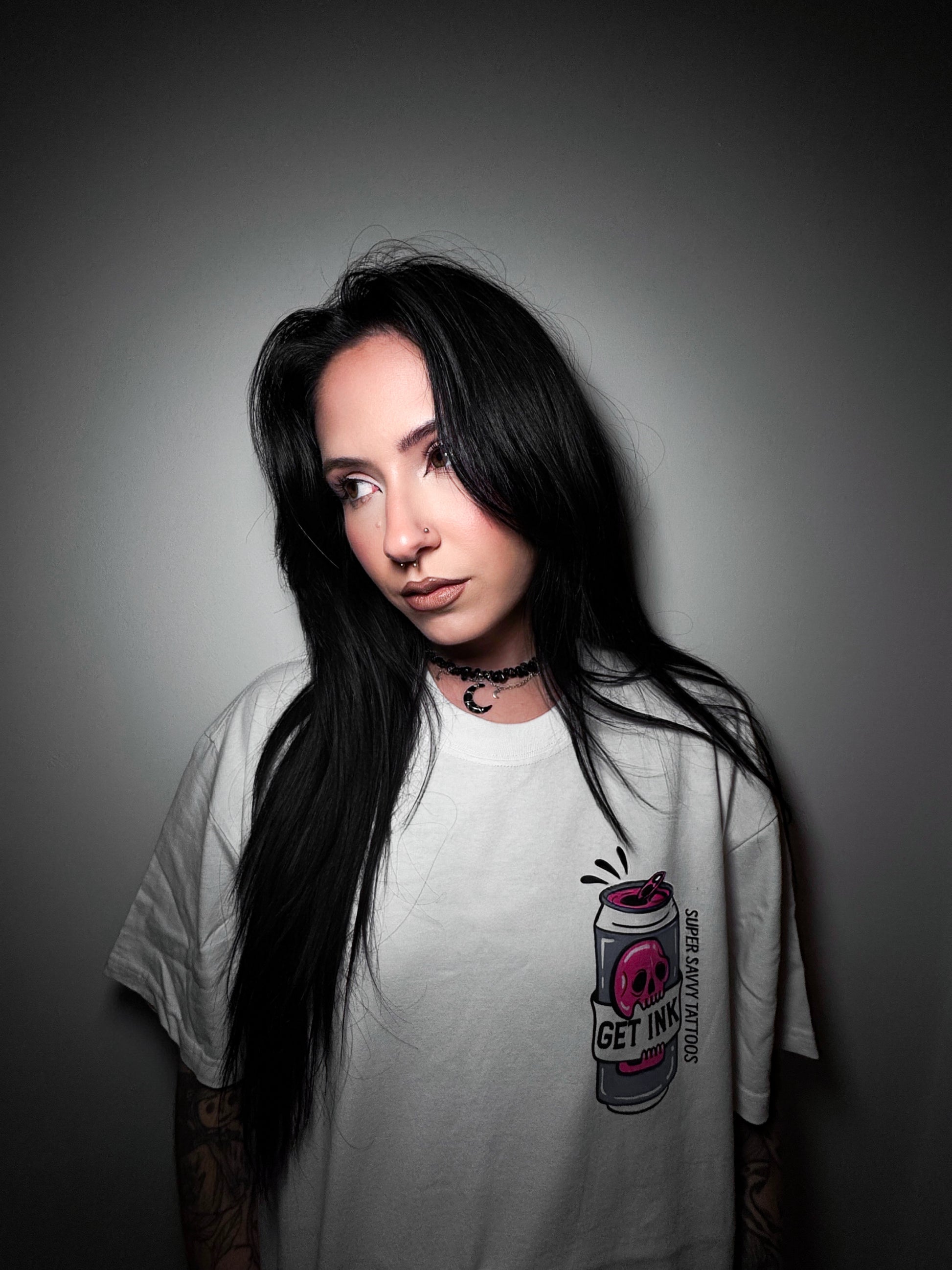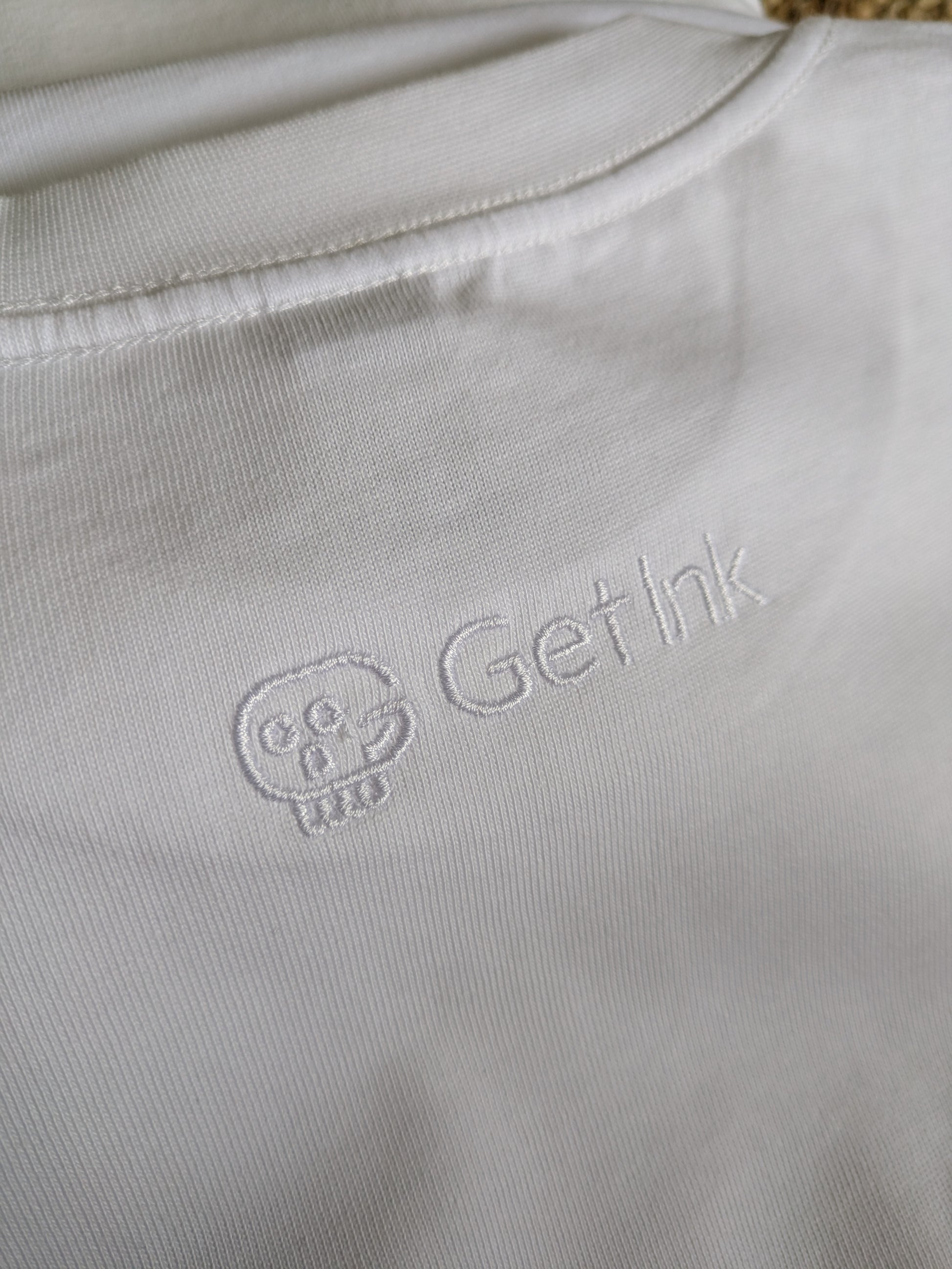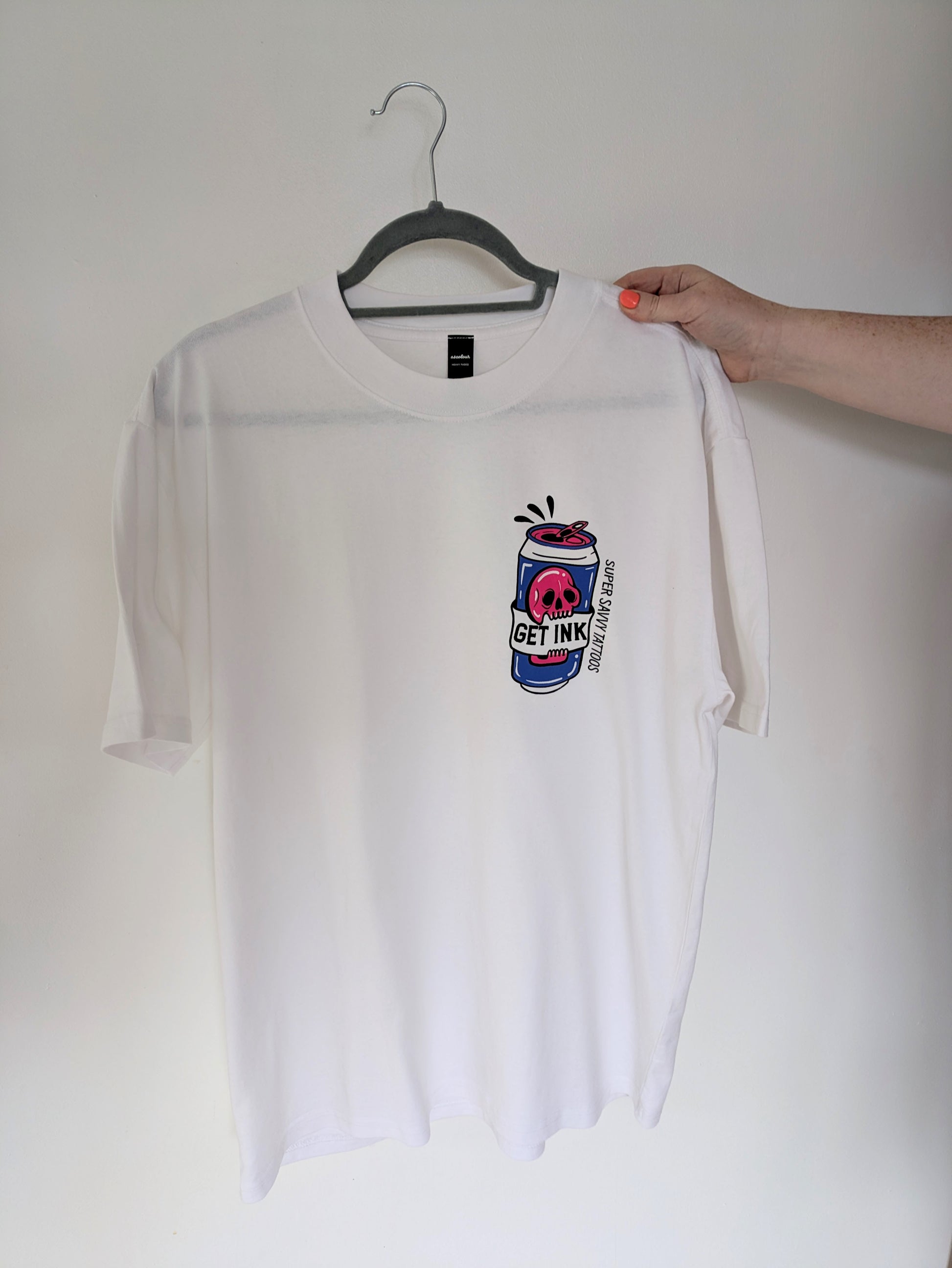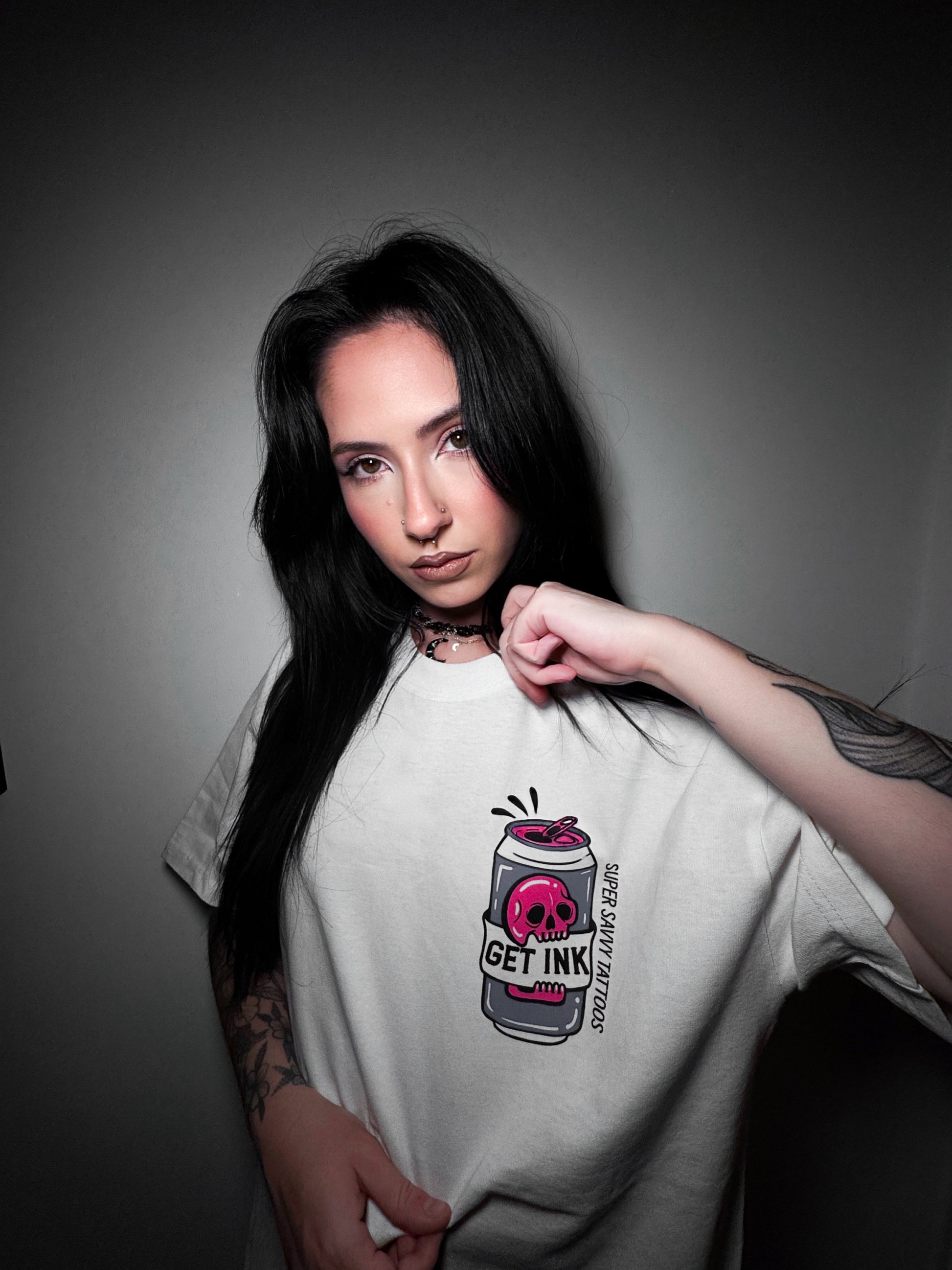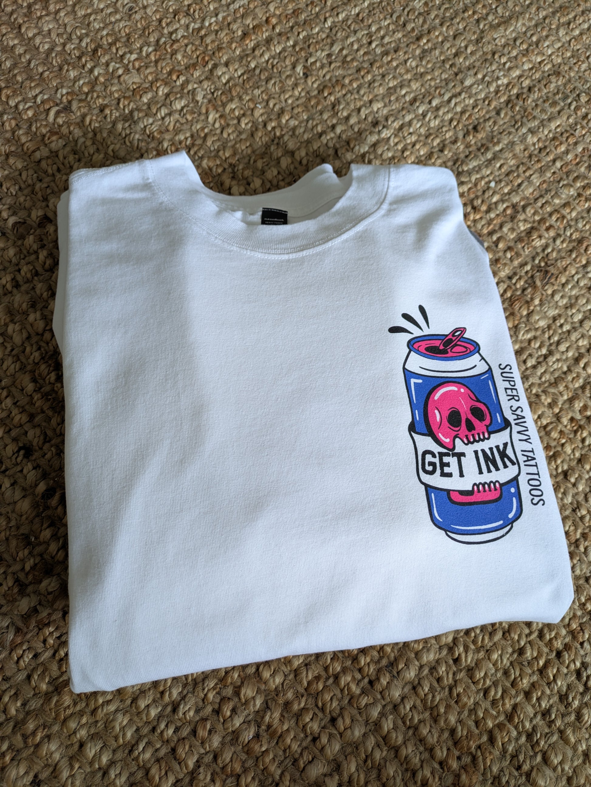 Custom can graphic with skull Get Ink embroidery detail on the back.