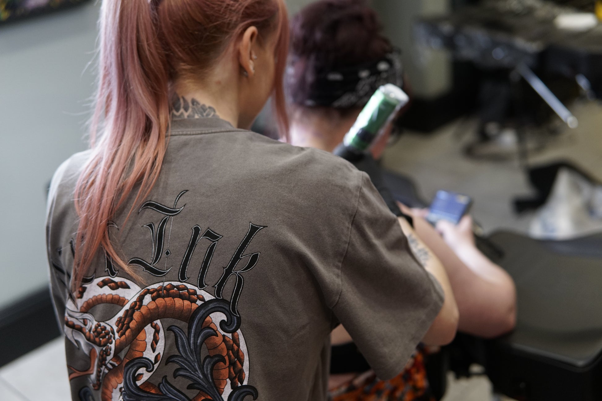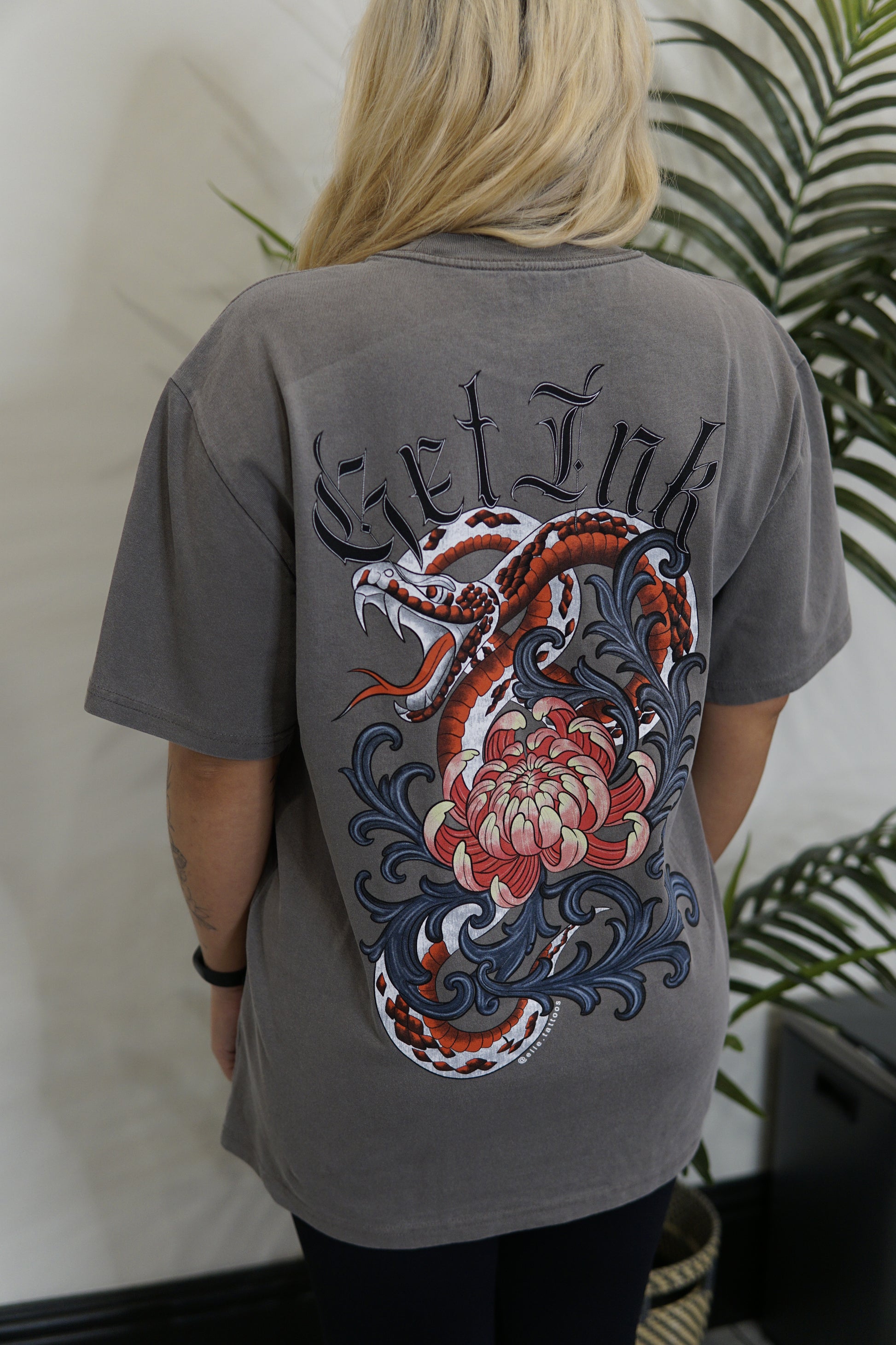 Get Ink skull embroidery detail on the front and large custom snake graphic on the back