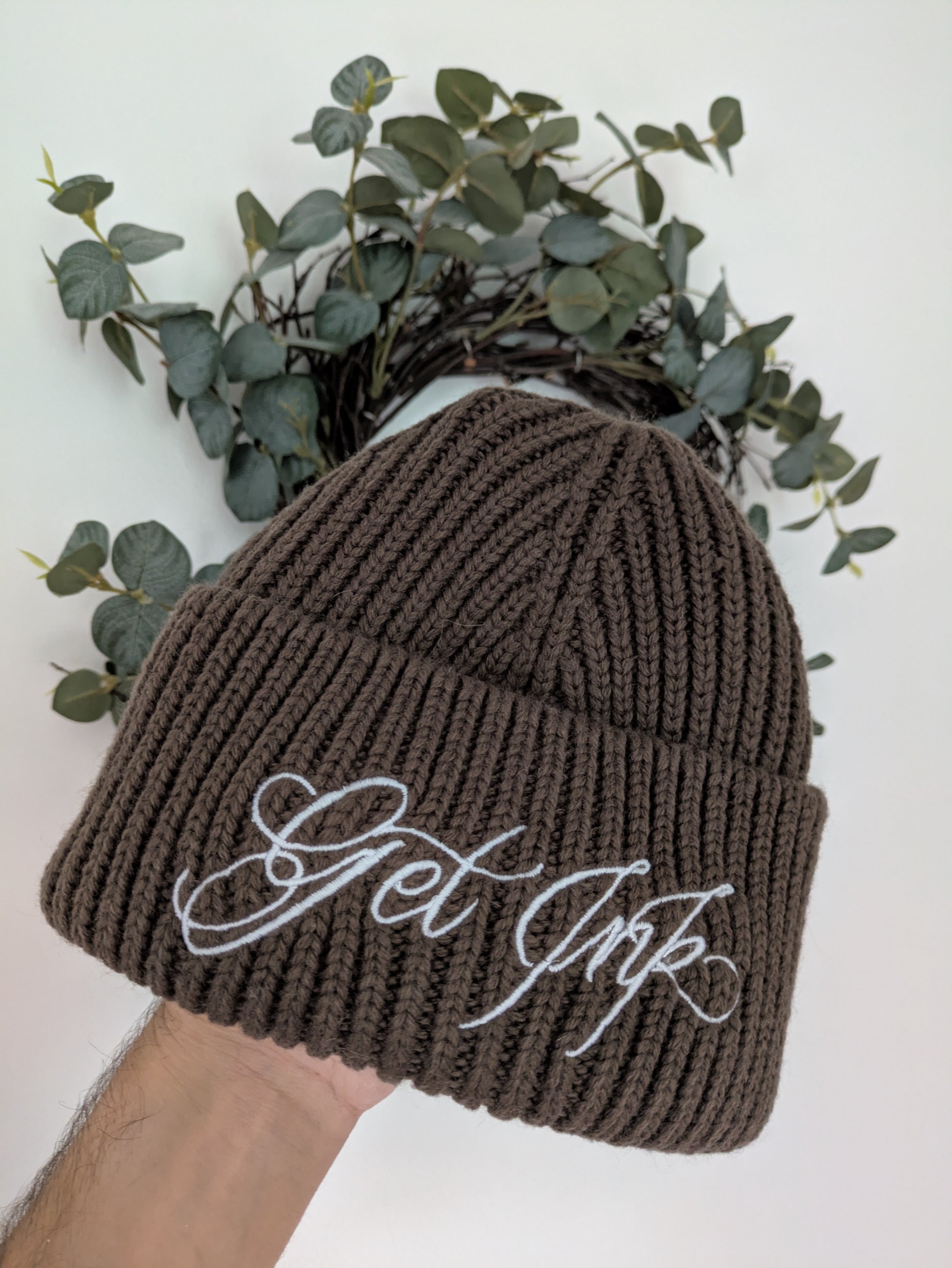 Walnut coloured fisherman style wide ribbed knit beanie. With Get Ink script and skull emblem 💯